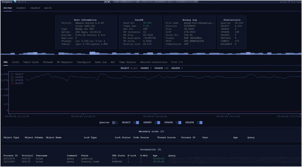 어쨌든, 최종 수정된 코드를 바탕으로 Dolphie를 설치하면 Aurora MySQL도 real-time으로 DB를 모니터링 할 수 있다.
