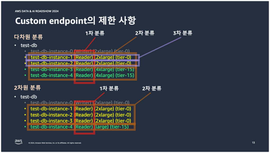 3차원 분류에 커스텀 엔드포인트를 적용하면 아래 화살표 오른쪽과 같이 커스텀 엔드포인트가 생성된다. 먼저 1차 분류는 Reader 엔드포인트로 이미 분류가 된 상태이다. 그다음 2차 분류를 위해 test-db-instance-1,2와 test-db-instance-3,4에 대한 커스텀 엔드포인트 2개를 생성해야 한다. 그다음 3차 분류를 위해 test-db-instance-1과 test-db-instance-2에 대한 커스텀 엔드포인트를 각각 1개씩 총 4개의 커스텀 엔드포인트를 생성해야 한다.