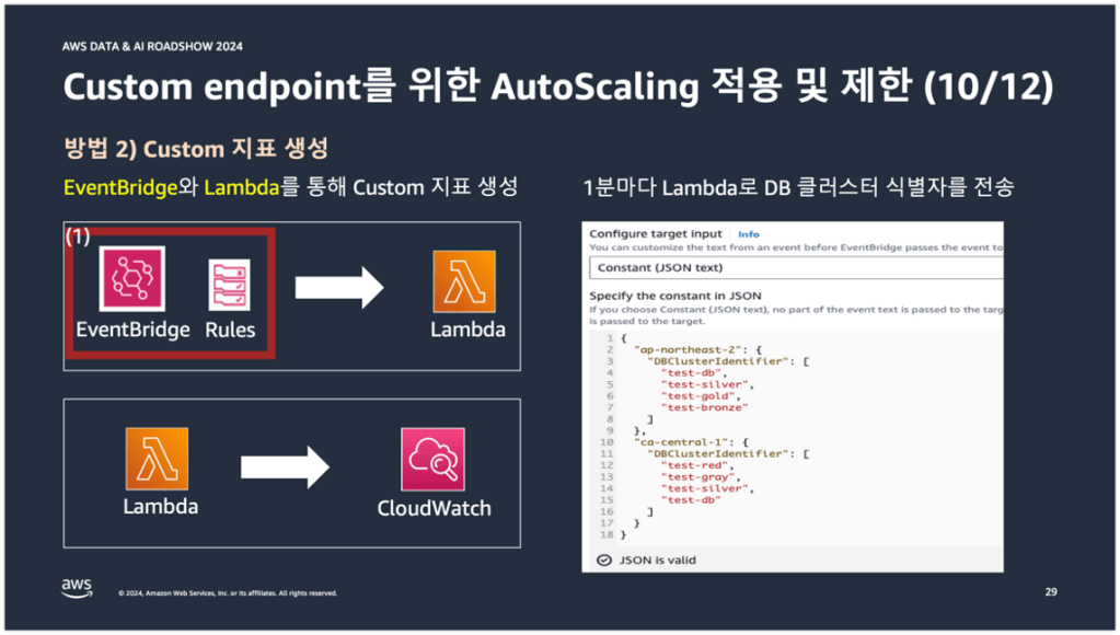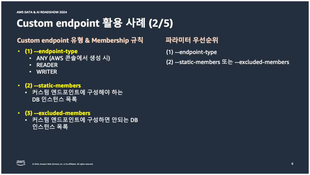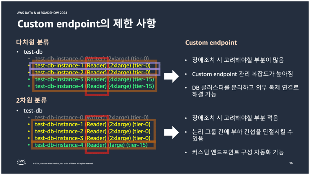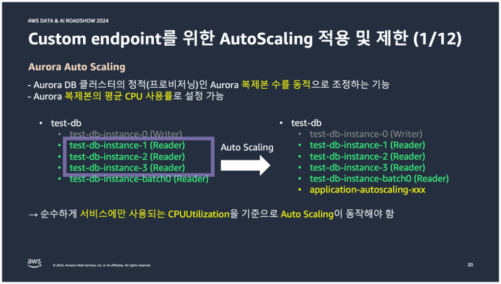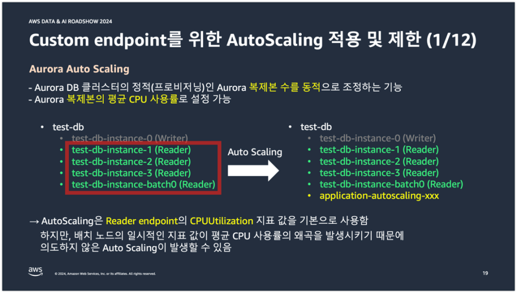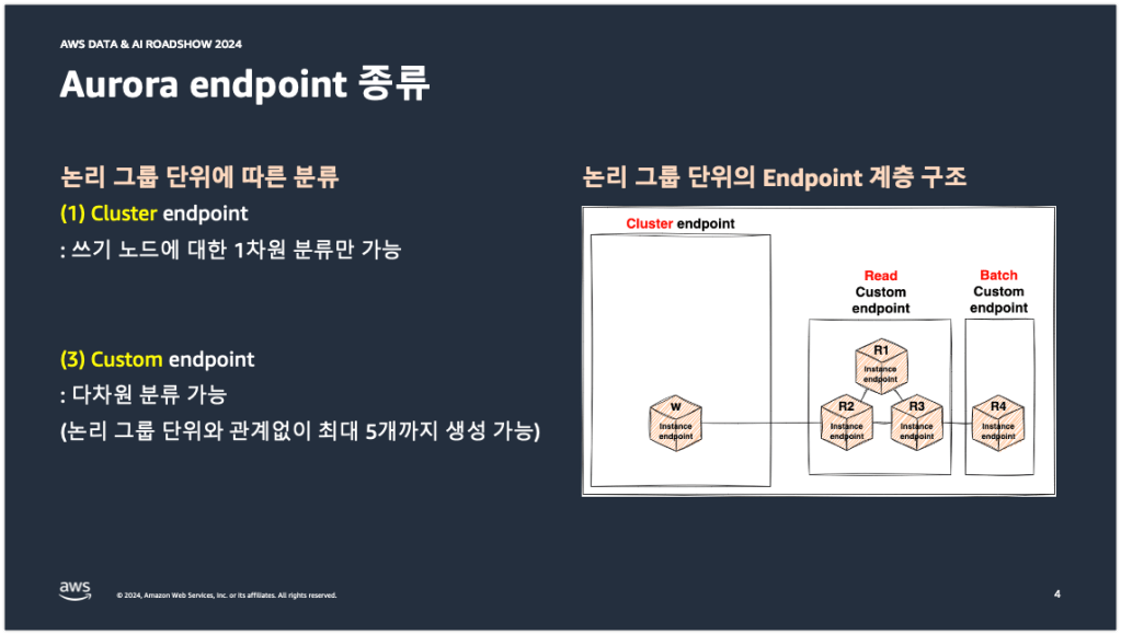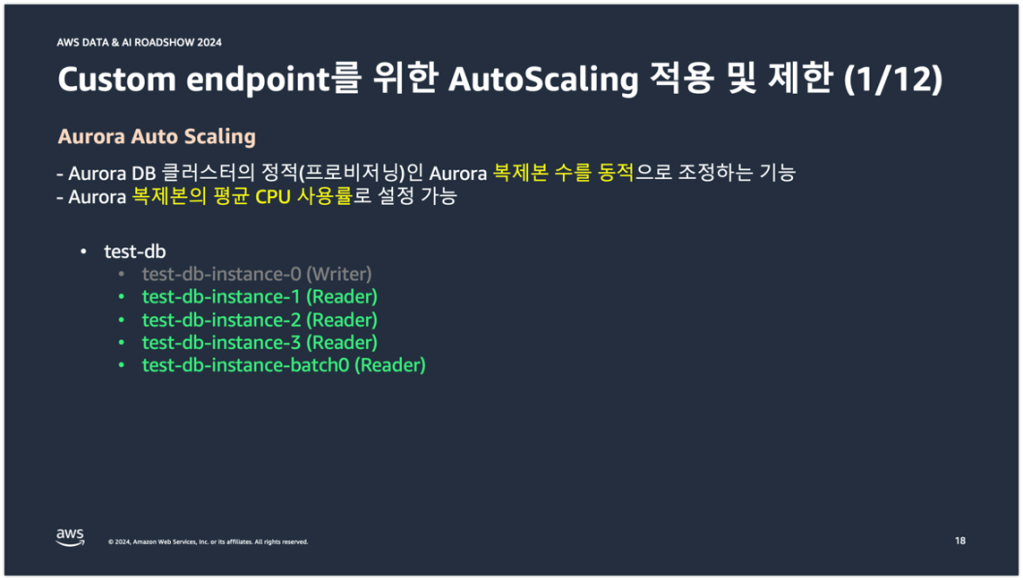 오늘은 2024년 6월 18일(화요일)에 AWS DATA & AI ROADSHOW 2024에서 Aurora custom endpoint와 AutoScaling 활용 사례에 대해서 발표한 내용을 공유해보려고 한다.