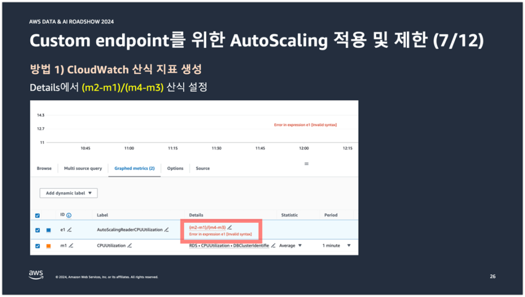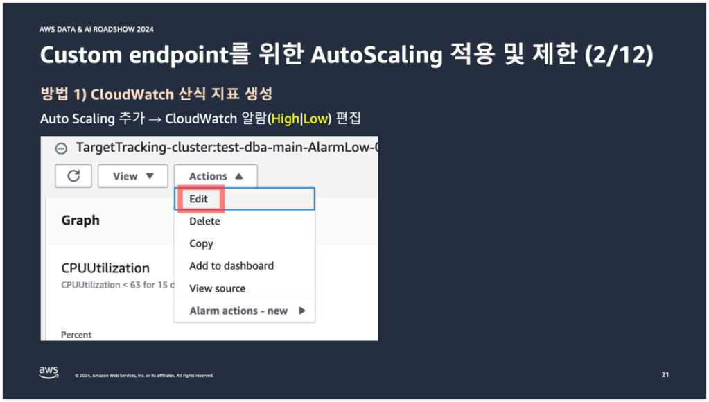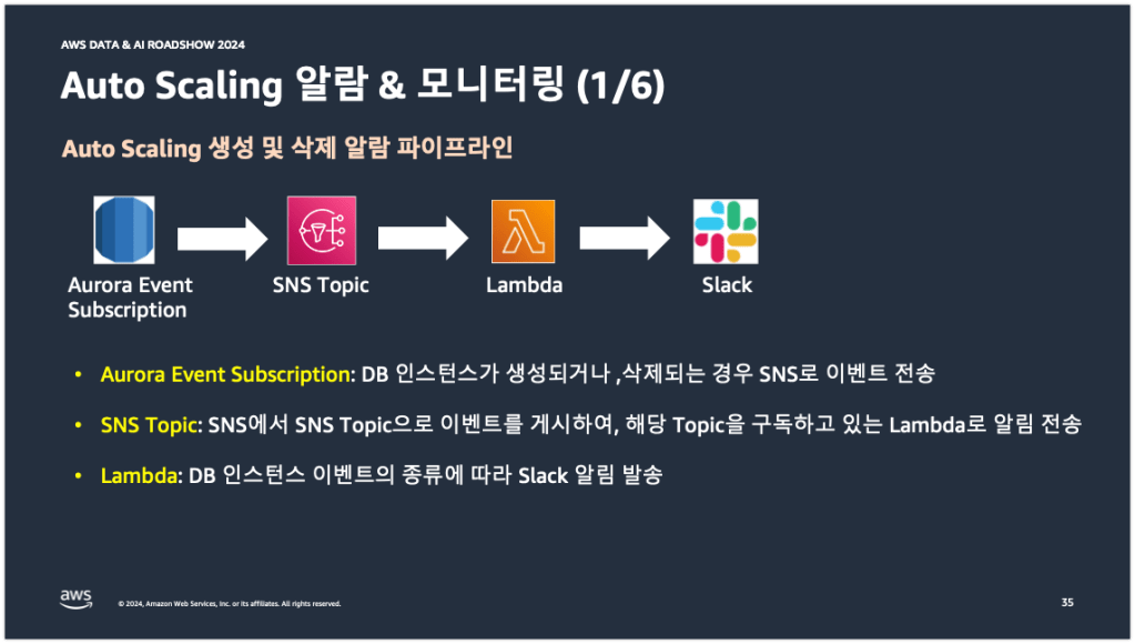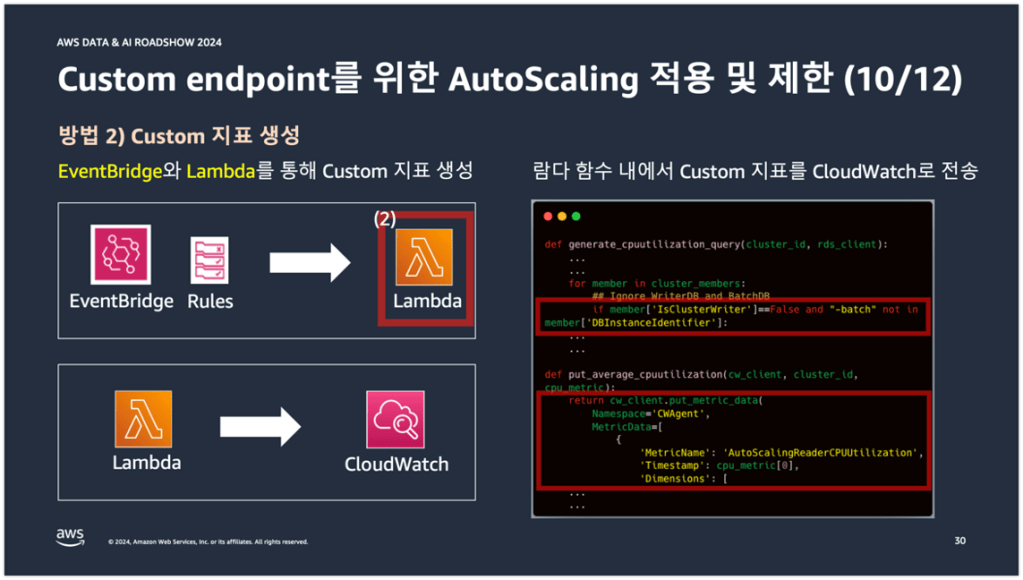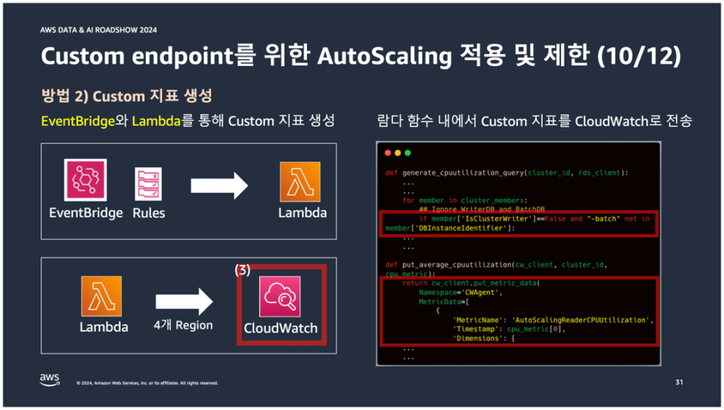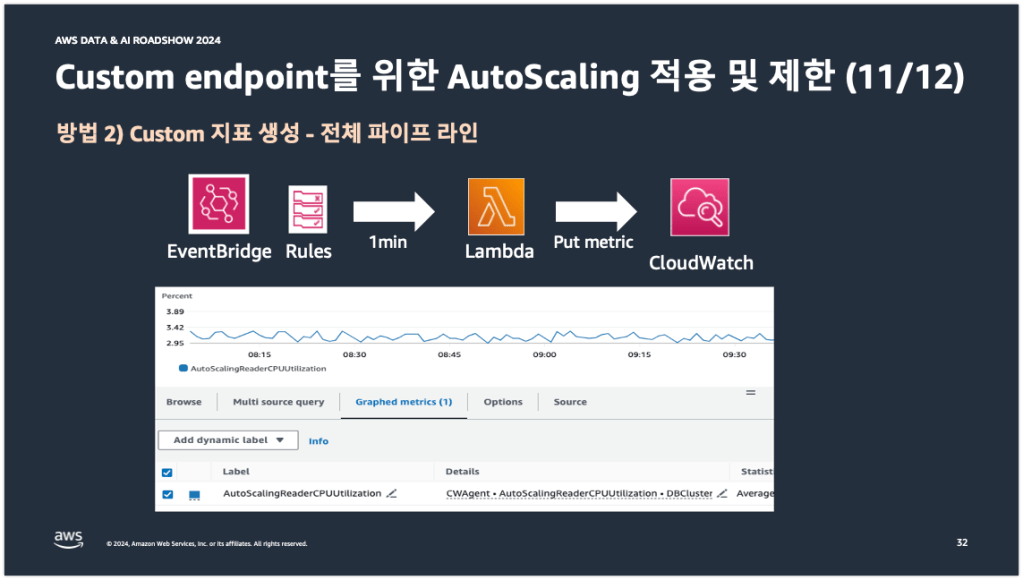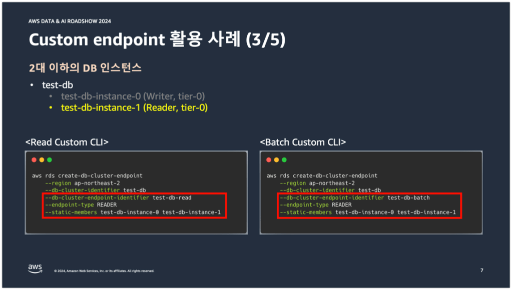 오늘은 2024년 6월 18일(화요일)에 AWS DATA & AI ROADSHOW 2024에서 Aurora custom endpoint와 AutoScaling 활용 사례에 대해서 발표한 내용을 공유해보려고 한다.