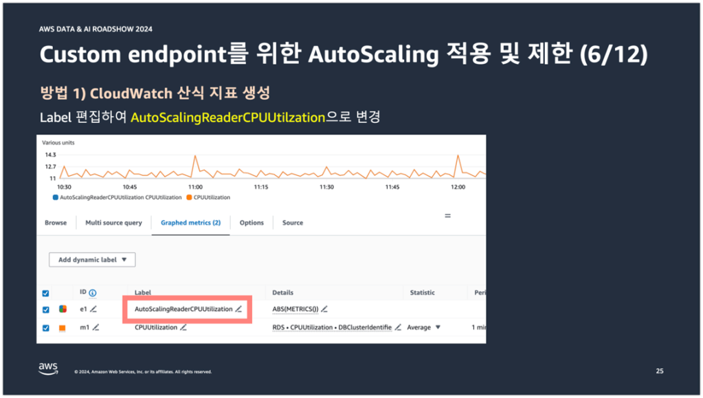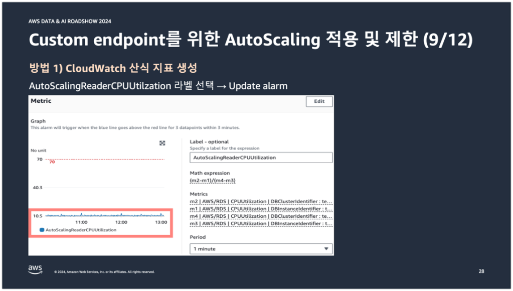 그러면 첫 번째 방법과 같이 Auto Scaling 동작 조건에 AutoScalingReaderCPUUtilization 커스텀 지표가 사용되는 것을 확인할 수 있다.