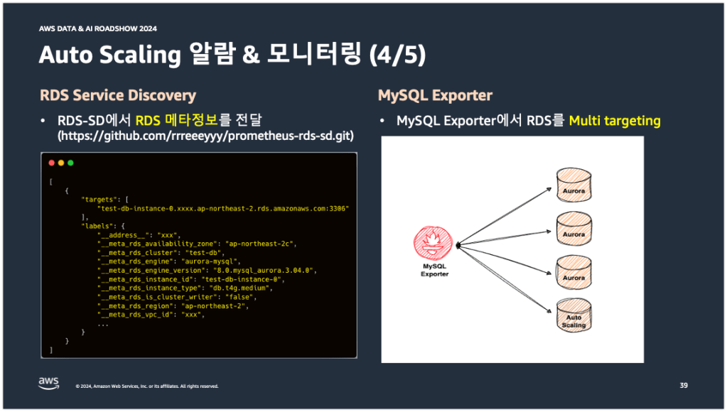 아래 왼쪽 그림은 RDS-SD 프로세스에서 조회하는 RDS 메타 정보이다. 메타 정보 안에는 targets라는 필드가 보이는데, 이 필드에 타겟 정보(DB 인스턴스의 DNS)가 포함되어 있다. 이 정보를 프로메테우스가 읽어들여서 MySQL Exporter로 전달하는 것이다.