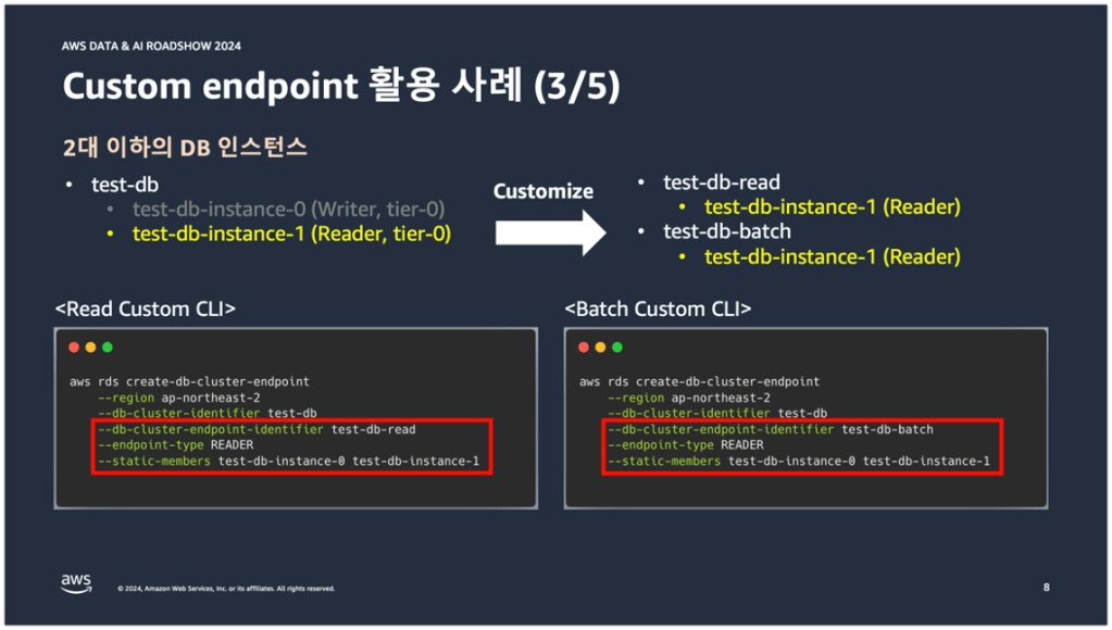 다음으로, 3대 이상의 DB 인스턴스인 경우도 살펴보겠다. 3대 이상의 DB 인스턴스인 경우에는 앞서 설명했듯이 Batch 커스텀 엔드포인트를 위한 batch 문자열을 가진 DB 인스턴스가 1대 이상씩 존재한다. 그래서 Read Custom CLI와 Batch Custom CLI 명령을 수행할 때 Batch DB 인스턴스만 잘 핸들링 해주면 된다.
