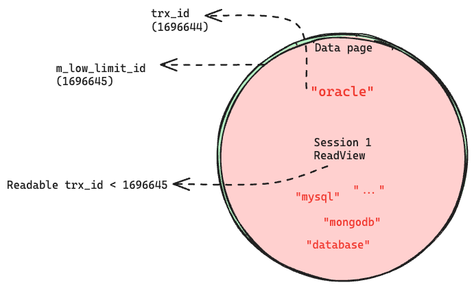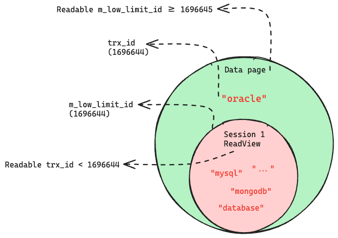 아래 그림과 같이 세션 1의 ReadView는 m_low_limit_id(=1696644) 값보다 크거나 같은 trx_id의 데이터는 읽을 수 없다. 즉 m_low_limit_id 값이 최소 1696645는 되어야 “oracle” 단어가 포함된 레코드를 읽을 수 있다는 의미이다.