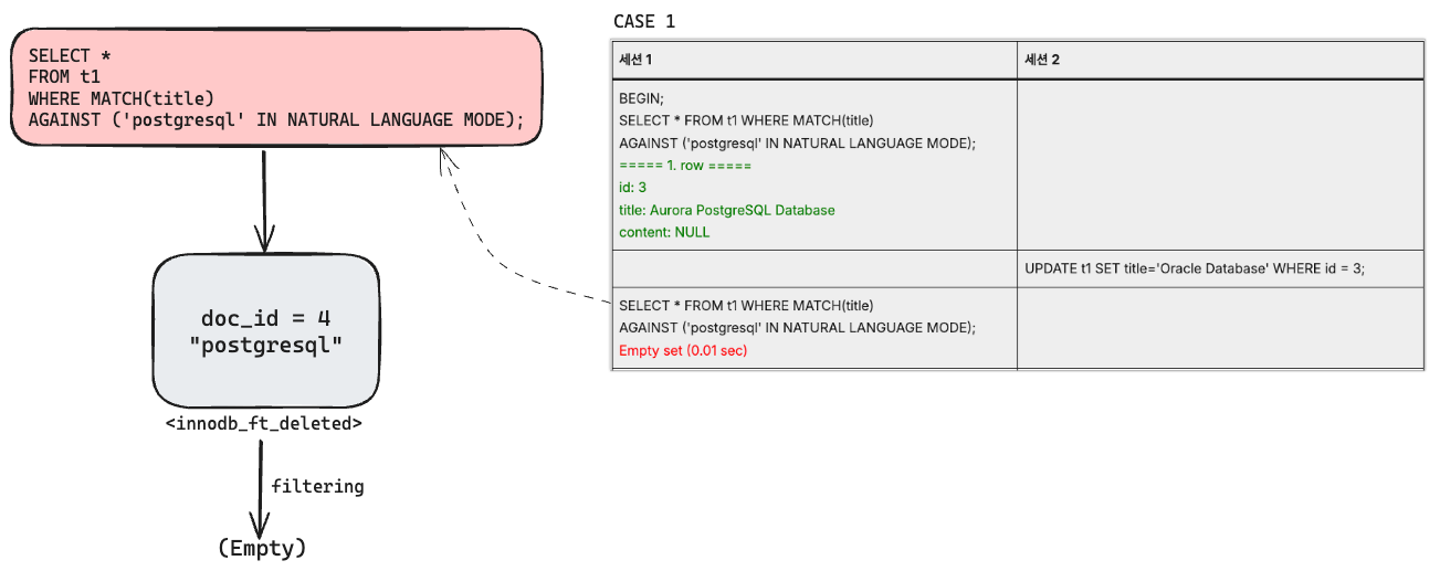 즉, 세션 2 업데이트 이후에 세션 1에서 “postgresql” 단어의 전문 검색 결과가 0건인 것은 innodb_ft_deleted 테이블에 의해 “postgresql” 단어가 속한 DOC_ID(=4)가 검색 결과에서 필터링 되었기 때문이다.