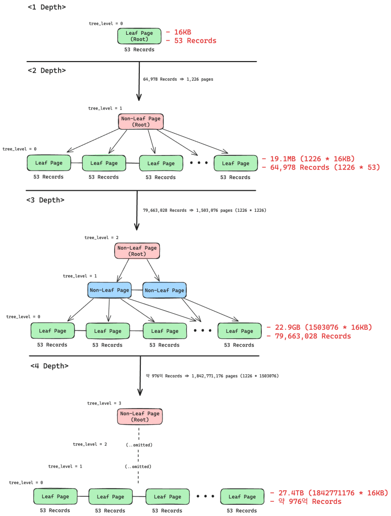 깊이 1의 user 테이블 전체 레코드 건 수는 리프 페이지밖에 존재하지 않으므로 최대 53건(16KB)이며, 깊이 2의 user 테이블 전체 레코드 건 수는 ‘넌 리프 페이지의 레코드 건 수 * 리프 페이지당 레코드 건 수’이기 때문에 1226*53 이므로 최대 64,978건(19.1MB)이다. 동일한 방식으로 B-tree 인덱스의 깊이 3은 최대 약 8천만 건(22.9GB)이며, 깊이 4는 최대 약 976억 건(27.4TB)이다. 27TB의 대용량 테이블임에도 B-tree 인덱스의 깊이가 4에서 그치는 것이다.