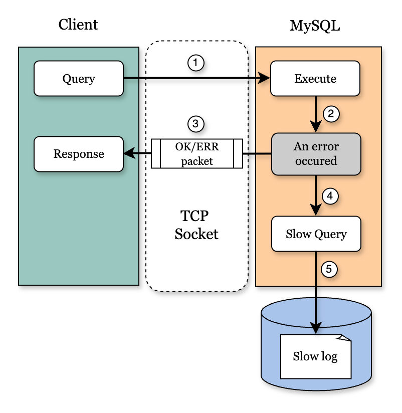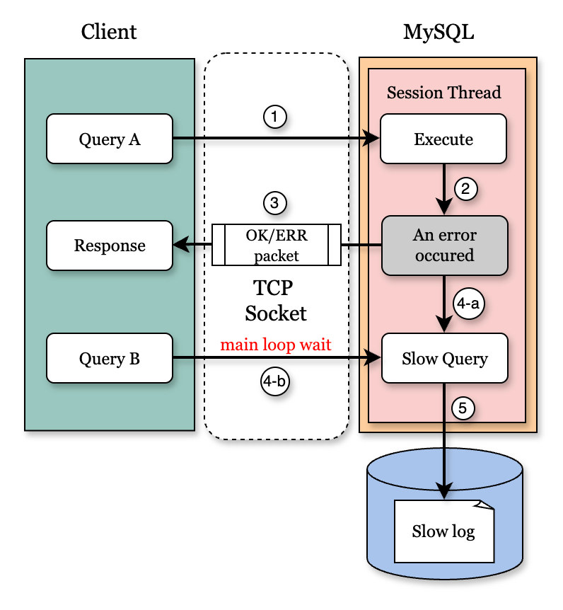 그림 1에서 보는 바와 같이 클라이언트는 MySQL 서버와 TCP 핸드셰이크를 통해 연결을 맺고 인증 과정을 거쳐 ① 쿼리를 요청하고, MySQL 서버는 파싱 과정을 거쳐 ② 쿼리를 수행한다. 이 때 중복키 오류, 잠금 대기시간 초과, 데드락 오류 등이 발생하면 MySQL 서버는 클라이언트에게 ③ 오류 패킷을 전송하며, 전송이 끝나고 나면 그제서야 ④⑤ 슬로우 쿼리 로깅을 실행한다.